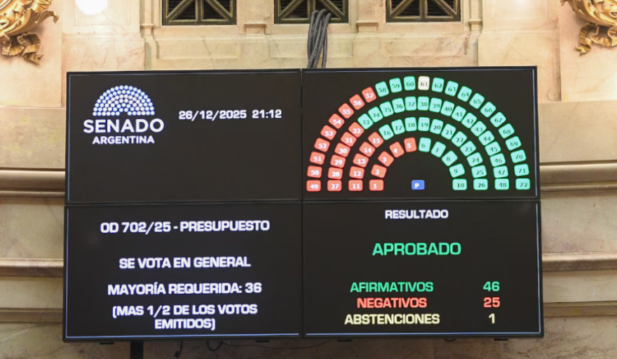 El Senado de la Nación sancionó la ley de Presupuesto 2026, el primero aprobado durante la presidencia de Javier Milei, tras una votación que reunió 46 votos afirmativos, 25 negativos y una abstención. La iniciativa ya había obtenido media sanción en la Cámara de Diputados y quedó formalmente convertida en ley con su tratamiento en el recinto de la Cámara alta.